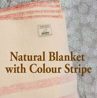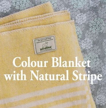 The blankets are made from the wool of our Polled Dorset sheep and are preshrunk. They are available in two styles – Natural with Colour Stripe, or Colour with Natural Stripe in a variety of colours (the same as our yarn colors).