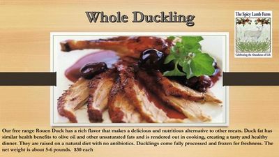Our free range Rouen Duck has a rich flavor that makes a delicious and nutritious alternative to other meats. Duck fat has similar health benefits to olive oil and other unsaturated fats and is rendered out in cooking, creating a tasty and healthy dinner. They are raised on a natural diet with no antibiotics. Ducklings come fully processed and frozen for freshness with a giblet pack. The net weight is about 5-6 pounds.